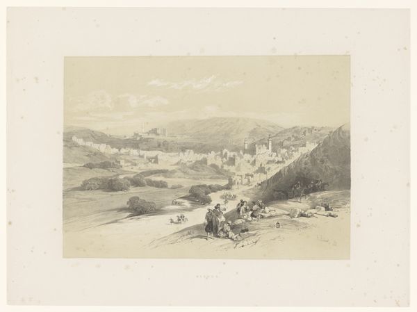 Curator: The first impression this image makes is one of serene tranquility; there’s a soft stillness to the scene. Editor: Indeed. What we're looking at is Charles Bernhoeft's "Gezicht op het kuuroord te Barr," a gelatin silver print created sometime before 1894. It captures the spa town of Barr. It invites us to reflect on how such imagery bolstered Barr's reputation as a therapeutic escape. Curator: Thinking of gelatin silver prints, it is incredible how ubiquitous and relatively accessible this particular process was at this time, especially in relation to fine art photography. The means of reproduction were much easier than other printing techniques. Editor: Precisely, the rise of gelatin silver printing made photographic production far more efficient, contributing to the medium’s growing visibility. It’s interesting to think about how these images circulated. Curator: What strikes me most is the use of light; the greyscale lends the picture an air of timelessness. It directs the viewer’s eye, making one consider the various houses dotted on the landscape. What of their construction, of the social dynamics within them? Were they also part of the spa or only for locals? Editor: A good point. Bernhoeft's decision to photograph Barr probably catered to the rising tourism of the time. The act of creating, selling, and owning prints such as this supported not only the artist's lifestyle, but that of the burgeoning tourism market in Barr and, arguably, the upper middle-class that consumed them. Curator: The choice of capturing a landscape and village view certainly speaks to that wider movement. He could have zoomed in for portraits or highlighted an architectural aspect instead. There are signs for Luftkurort Horwald, so Bernhoeft obviously understood the marketable potential in spa and sanatorium. Editor: Right, the inclusion of the signage reminds us how explicitly places sold themselves, commodifying relaxation and health through photography. We’re seeing the deliberate construction of an image meant to project an idealized version of life in Barr. It makes me wonder about the labor conditions behind constructing these utopian landscapes. Curator: True. So many layers within the image! It makes you ponder just what aspects of its legacy still ring true in the spa. Editor: Absolutely, it's an invitation to interrogate not only its aesthetic qualities but the intricate political and economic forces it represents.