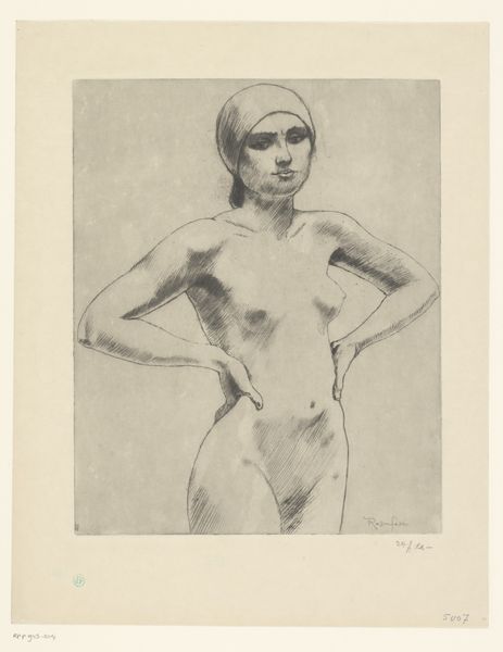 Editor: We're looking at "Vrouwelijk naakt, gezeten op een bank, de hand tegen het hoofd," a pencil and graphite drawing from 1920 by Samuel Jessurun de Mesquita. It's a seated nude, fairly simple in its composition, and has an almost melancholy feel. What catches your eye when you look at it? Curator: What interests me is the labor, and the physical process that went into making this. Think about the artist’s hand, moving repeatedly across the paper to build up the tone and texture with graphite. It's almost industrial, wouldn’t you say? Editor: Industrial? In a nude drawing? I wouldn't immediately think of that connection. Curator: Well, consider the materiality. Graphite is mined, processed, manufactured into pencils – instruments for both artistic expression and, importantly, industrial drafting. It’s this very blurring of art and craft that I find fascinating here. Does the act of sketching this nude figure become another form of labor, linked to the broader material culture of the time? Editor: So you're saying the *making* of the image is as important as the image itself? I hadn't considered the pencil as almost a little machine! Curator: Exactly! The 'high art' subject matter, the nude, is brought down to earth, interrogated through the lens of its own production. What does it tell us about consumption, too, I wonder? Was this meant for display, or as study? Editor: That’s given me a whole new perspective. I usually just think about the final image, not everything that went into creating it. It changes how you understand the artwork completely. Curator: Indeed. By thinking about production, labor, and materials, we can unearth new meanings in even the most traditional of subjects.