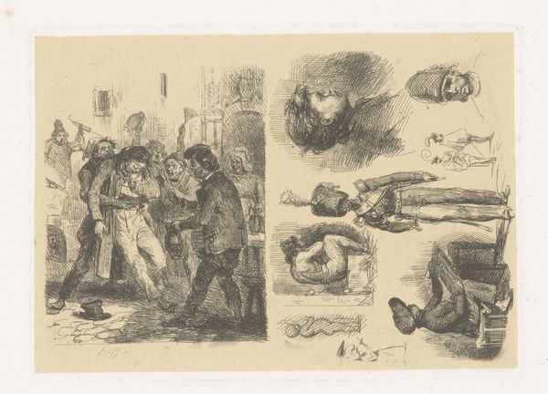 Editor: This is "Naakte oude man aan een deur gespijkerd door soldaten die zijn familie dwingen te kijken", a pen and ink drawing on paper by Mihály Biró, made around 1920. It's quite a harrowing scene. The forced observation, the graphic violence... How do you see this work functioning as a historical document, so to speak? Curator: Well, the horror you’re sensing is quite deliberate. As a history painting rendered in an Expressionist style, this work reflects the socio-political upheavals after World War I. The raw lines and disturbing imagery don’t just depict violence; they critique institutional power. Biró forces us to confront the human cost of conflict and oppression, a recurring theme during that interwar period, don't you think? Editor: Absolutely. So, beyond documenting the violence, do you think it is making a comment about the function of imagery and public memory at the time? Curator: Precisely. Consider who is commissioning and viewing such work. Is this for private contemplation or public denouncement? And what role do museums, like the Rijksmuseum where it’s now held, play in shaping its meaning and our access to this difficult narrative? How does its display today impact the reception of the scene depicted? Editor: It makes you wonder if the Rijksmuseum is amplifying a historical perspective that was silenced at the time. Curator: Exactly! It's a powerful, albeit painful, statement. Museums inadvertently give new voice or recontextualize forgotten ones. That is what fascinates me about Expressionism and its complex entanglement with history. The visceral, disturbing imagery serves to highlight political struggles and personal trauma of the 20th century in a very stark and poignant manner. It is impossible to miss the public role this art sought to fulfill. Editor: It definitely gives me a lot to consider about whose stories we choose to remember and how we remember them through art. Thanks for your insight! Curator: My pleasure! Always glad to examine how institutions shape what we see and understand about the past through art.