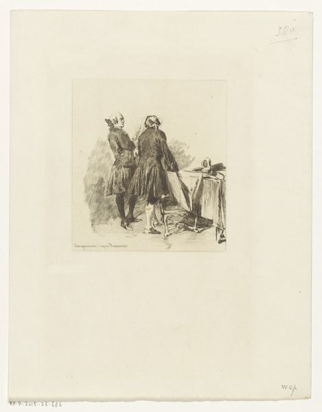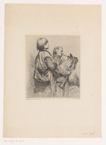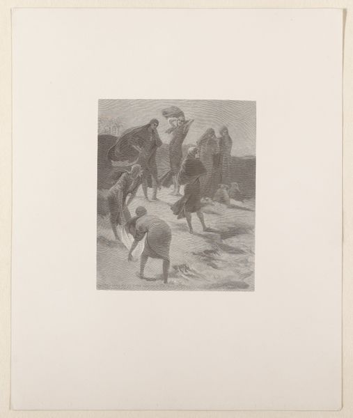 Curator: This etching, titled "Vlucht naar Egypte," or "Flight into Egypt," was created by Lodewijk Schelfhout in 1931. It's currently held here at the Rijksmuseum. What's your first impression? Editor: Somber, definitely somber. It feels weighted, almost oppressed. The grayscale rendering gives it this serious tone. But look at that landscape: flat, kind of bleak... it really mirrors the tension in the biblical story, doesn’t it? Curator: Absolutely. Schelfhout uses the print medium perfectly to amplify that feeling. Consider the line work – short, almost frantic hatching gives volume and form. And there's a stark contrast between the white halo on Mary, that pulls the viewer in and sets a point of departure against the very, very dark. Editor: It almost vibrates. And see how the horizontal lines in the background emphasize the length of the journey. The rigidity reminds me of early Expressionist woodcuts, stylistically, especially the raw almost intentionally harsh presentation. Curator: That's interesting. Although on its face narrative art, and inspired by biblical themes, I'm more fascinated by how the materiality pushes through. He creates a sense of depth and space, while acknowledging its surface through pattern and composition of figures against the horizon line. The symbolic load is massive of course: fleeing as refuge from potential death... It gets you in the guts, does it not? Editor: For sure. Especially with the formal elements that really enhance the weight of the whole ordeal. The compressed depth in the background; the small figure sizes emphasizing an expansive landscape; really emphasizes their precarious vulnerability against an unknown world. Even those rigid planes hint to their fears; something is looming... the line work captures it masterfully. I wonder, could that be the actual intent, here? Curator: I think we might be on the same page, perhaps even traveling to the same far flung landscapes of our own imagination as this small, solemn party. The interplay is complex and so delicate; how fortunate are we to bask for a while in this work.