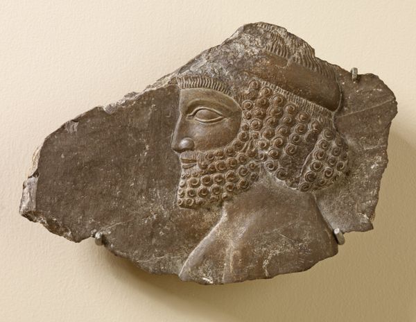 Curator: Before us is a Neo-Assyrian relief from around 883 BCE, titled "Relief Showing the Head of a Winged Genius." It's currently housed here at the Art Institute of Chicago. Editor: Winged genius, huh? My first thought? Stoic. Like, this guy’s seen some things, probably things he’d rather forget. He's hewn out of this imposing slab – a kind of solemn guardian, forever watchful. Curator: Exactly! These reliefs were often placed in palaces, serving to protect and even intimidate. Winged figures like this were believed to have apotropaic powers – they warded off evil. You see the detail in the carving, the intricacy of the beard and headdress. Editor: Intricate is an understatement. It’s amazing what they could do with stone back then. All those tiny curls, and the pattern of the feathers...it's incredible that it has survived so long. There is such a timeless feel about the piece; it hints to me of endless struggles for power and glory, etched in stone. Curator: The figure's clothing and adornments also tell us about the society. The multiple horned headdress suggests divinity, or at least a connection to the divine realm, so perhaps not just warding off evil but also in some sense able to appeal to higher forces to aid in the struggles of earthly power. He’s essentially a visual embodiment of power and protection, all rolled into one neatly carved package. It says "we’re not messing around" to anyone visiting the palace. Editor: I bet it worked. All those layers of symbolism...it’s visual overload. Even just the expression on his face – that controlled calm. But, look closely, I almost sense some weariness. The weight of all that responsibility is in his eyes. Perhaps that is just me projecting? Curator: Possibly! Though that projection shows how these sculptures become vehicles for communication over centuries. Editor: So true, the idea that those original intentions somehow echo down the ages. Still gives me shivers. I guess there's a reason these ancient artworks hold such power, after all. Curator: Absolutely. And by contemplating works like this, we gain glimpses into the complex cultures and belief systems of civilizations long past.