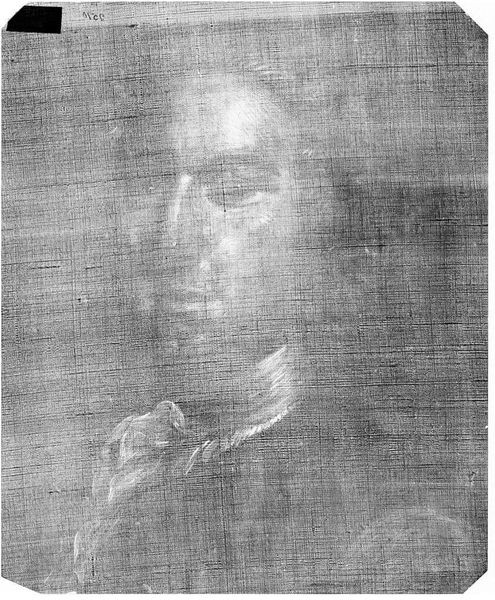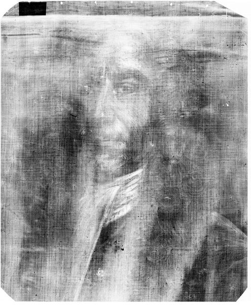 Editor: So, here we have an X-radiograph of Rembrandt's "Portrait of a Man." It's like seeing a ghost of the original painting. What secrets does this X-ray reveal to you? Curator: Well, it whispers of layers, doesn't it? Like peeling back time, or maybe an onion. X-rays show us the underpainting, the artist's first thoughts, the ghost images and changes that the artist made. Editor: Changes? What kind of changes? Curator: Maybe the angle of the head, perhaps the fall of the light. It gives an insight into the artist's creative process. It's like a conversation frozen in paint and now made visible again through science, which is pretty cool, wouldn’t you say? Editor: It is! I never thought about art in such a scientific way. Curator: It’s like magic; peering beneath the surface. Every old master painting holds a hidden history. Editor: Definitely gives me a new appreciation for the layers within a painting!