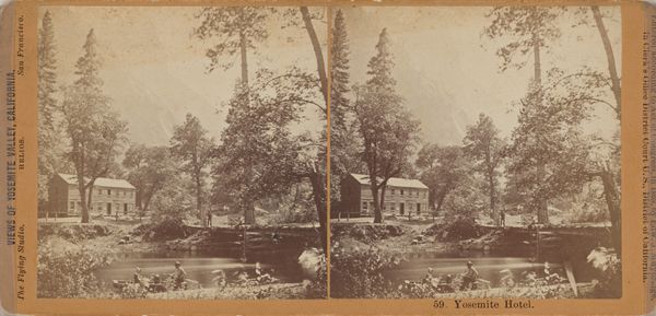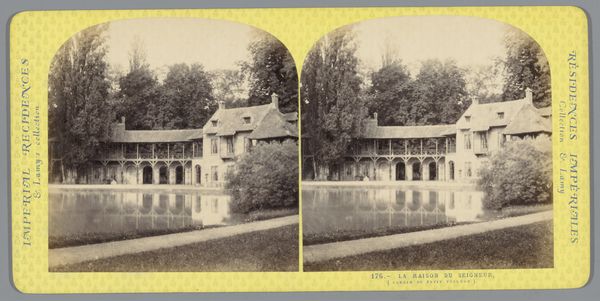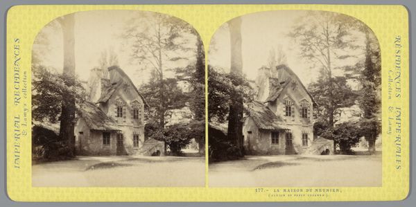 Curator: Here we have a stereo albumen print dating from sometime between 1860 and 1880, by Ernest Eléonor Pierre Lamy. It's titled "Huis of de Réchauffoir in Le Hameau de la Reine bij het Petit Trianon." Editor: That’s a mouthful! Visually, it whispers of secret gardens and simpler times. There's a certain peacefulness about it, but also a melancholy knowing that such idealized moments rarely last. Curator: Precisely! Lamy’s work, typical of this era, offers a window into the constructed nostalgia of the late 19th century. The "Hameau de la Reine," or Queen's Hamlet, was Marie Antoinette's pastoral retreat—an artificial village designed to mimic rural life. Editor: I'm struck by how staged it feels, even in this photographic image. Look at the careful composition, the placement of the tiny, almost doll-like figures in front of the building, those pruned mini-trees…it's not capturing raw nature but carefully arranging it. The light too. Curator: That sense of artificiality is key. The photographic process itself adds another layer, doesn’t it? This albumen print, with its warm tones and delicate details, romanticizes the scene. This "réchauffoir" or warming house becomes an idyllic space… though surely daily life wasn't so pristine. Editor: Exactly! You're not smelling the mud or feeling the wind, just getting the sanitized, Instagrammable version. It’s the architectural equivalent of Versailles’ powdered wigs and towering hairstyles – appearances matter more than functionality, really. Curator: So, what seems like a simple depiction of a quaint building speaks volumes about the desires and fantasies of a specific time, the desire to escape an increasingly industrialized reality through idealized nature. Editor: It's a gorgeous lie, isn't it? A perfect little world captured just so... and beautifully so! You almost forget the layers of artifice, you're seduced by the serene vision. Curator: Yes. Looking closely really unlocks a complex interplay between reality and illusion. A lovely photograph indeed.
