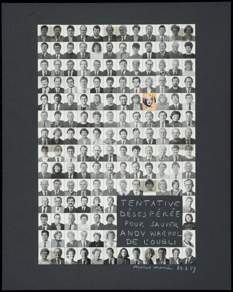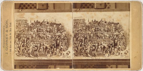 Curator: Well, this piece certainly makes a statement! It’s a composite albumen print made circa 1862-1863 by Brothers & Co. Ashford titled "Portretten van bekende personen" - or Portraits of Famous People. It’s like a visual census of the Victorian elite. Editor: Oh, my goodness, it's overwhelming! Like being crammed into a tiny, sepia-toned elevator with about five hundred serious faces! A Victorian version of Where’s Waldo, except everyone’s judging you. Curator: Precisely. These albums became popular forms of visual cataloging and were often produced serially for different markets. The albumen process itself – applying egg white to paper – gave it a particular sheen, almost like a simulated luxury. What is being emphasized here is class and fame. Editor: It's fascinating how these photographic “scrapbooks,” almost predating our current influencer culture, were meticulously assembled. I'm sure a lot of power went into choosing who made the cut, metaphorically, of course. What a social barometer! Curator: Indeed. And the idea that a hand-magnifying glass is necessary to appreciate each portrait... it’s almost a commentary on how the proliferation of images, even then, demanded closer inspection to differentiate individuals within the masses. Note that power operated through images, who and how their portraits were used was politically charged. Editor: Right? It’s a little dystopian too, in its way, the promise that every face will be perfect only under magnification… Like, only up close, after intense scrutiny, does the Victorian ideal really hold. It kinda underscores how easily people vanish into history, becoming one huge brown study. Curator: Well, these albums offered a vision of national and transnational belonging but this belonging wasn’t offered equally or readily. Its accessibility also depends on the beholder, as one’s class or political power plays a huge role. These images create a social hierarchy by immortalizing specific identities, genders and race as key. Editor: Thinking about it now, I get this deep urge to flip it over, check who *wasn't* deemed "perfect" enough. Like, let’s see who got left behind! Anyway, my nose is twitching... albumen! Curator: This visual inventory tells us about more than just its subjects, it shows what society then considered worthy, and reminds us of the exclusionary structures, in that time as well as ours. Editor: Makes you wonder, what kind of portraits are we mass-producing now, what judgments they might contain, and who's getting a free ticket to perfect-ville?