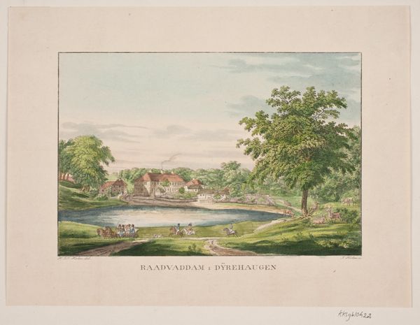 Curator: Here we see Georg Melchior Kraus’s “Das Waldhaus in Wilhelmstal bei Eisenach,” likely created between 1800 and 1806, utilizing watercolor, chalk, and colored pencil on paper. Editor: It’s bathed in this lovely, almost ethereal light, isn’t it? The subdued palette lends a dreamlike quality to the composition. Curator: Absolutely. The Waldhaus itself, a symbol of Enlightenment rationalism perhaps, sits poised above the landscape, reflected in the water, indicating humanity’s place within—yet slightly separate from—the natural world. Editor: The reflections in the water certainly double the impact of form, but it also fractures it slightly, disrupting the solidity. It creates an interesting visual tension. The horizontality and simple symmetry are very satisfying. Curator: Interesting observation. Symbolically, water often represents the subconscious or the spiritual realm, mirroring our physical reality yet distorting it, suggesting deeper, unseen truths. Romanticism certainly valued subjective and sometimes subconscious or emotional truths. Editor: Precisely! I’m intrigued by the composition itself—the placement of the building slightly off-center, the framing by trees on either side. There’s a dynamic interplay between the architectural forms and the organic, flowing lines of nature. And all are clearly and efficiently placed in support of each other. Curator: And, think, the forest as a site of initiation and transformation – that archetypal Romantic return to the wild! It asks what happens to people's hearts, beliefs and social connections within that setting. How are norms negotiated when people are under that kind of shelter? Editor: Right! This isn’t simply a picture, but rather a meticulously structured experience with a clear visual hierarchy—guiding the viewer's eye and evoking contemplation. It’s a testament to Kraus' control over the medium. Curator: A synthesis of order and feeling that reveals just how powerful seemingly “quiet” symbols of both nature and culture can be when interwoven. Editor: Yes, and the formal harmony of shapes and colors contribute to the pervasive sense of serene beauty. Curator: It leaves me pondering humanity's role as both an observer and an integral part of the natural order.