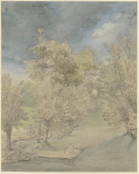 Carl August Lebschee created "Wooded Landscape with Stag" using watercolor, ink and graphite on paper. The composition is dominated by the intricate branching structure of a large tree on the left, its leaves rendered with delicate washes of green and yellow, contrasting with the dense, darker woods on the right. The scene is infused with a tranquil and contemplative mood. The artist's technique creates depth and atmospheric perspective. Note how Lebschee uses subtle gradations of tone and color to suggest distance, guiding the eye towards the horizon. The delicate brushwork captures the textural qualities of the natural world, from the rough bark of the trees to the soft foliage and even the subtle gradations in the sky. Through this formal approach, Lebschee doesn't just depict a landscape but also evokes a deeper, emotional connection to the environment, inviting viewers to reflect on their relationship with nature. This piece invites an ongoing dialogue about the interplay between artistic representation and our perception of the natural world.