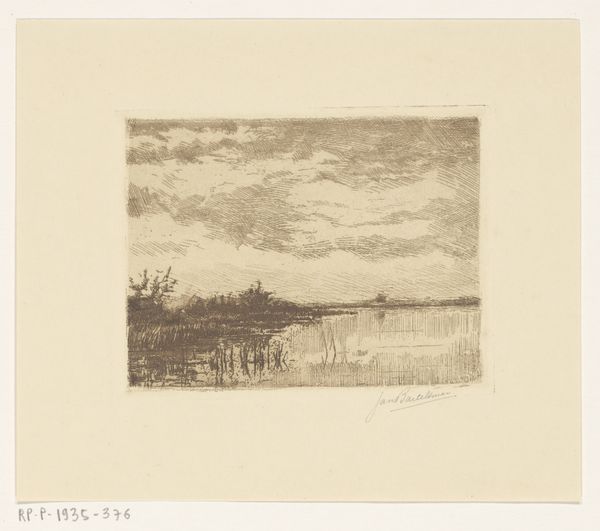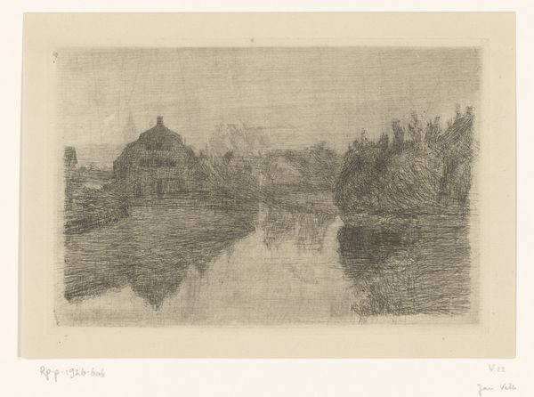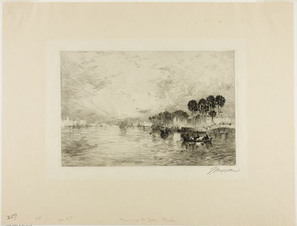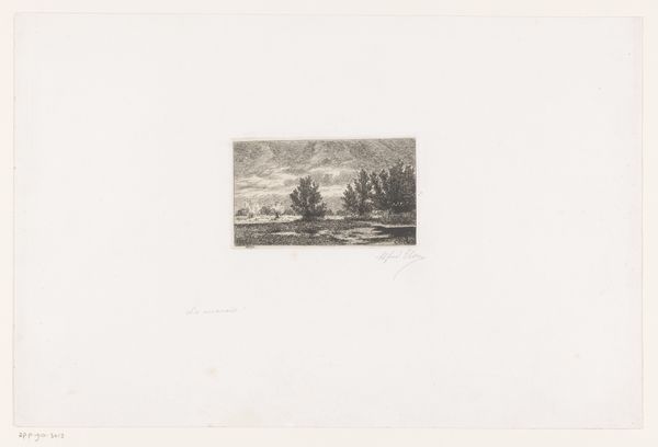 Maxime Lalanne created this etching, "View of Nogent," offering us a glimpse into the French landscape through the lens of 19th-century printmaking. The etching captures a scene of leisure and industry along the river, yet the cultural context of 19th-century France complicates this idyllic image. Lalanne, situated within the rise of the bourgeoisie, presents a world that often obscures the labor and social inequalities that underpinned it. How does this tranquil scene reflect the complex realities of class and labor during this period? The detailed lines and tonal variations achieved through the etching process speak to Lalanne's technical skill, but also invite us to consider the role of art in shaping perceptions of place and identity. Consider how Lalanne’s artistic choices might either reinforce or subtly question the dominant narratives of his time, prompting us to reflect on the stories we tell ourselves about history and progress.