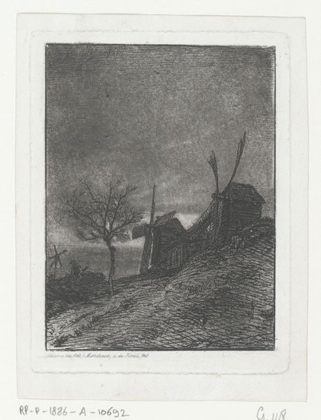 Editor: This is "Landscape with Trees and a House" by Anton Mauve, made sometime between 1848 and 1888. It’s an etching, and the whole scene is rendered in these delicate, scratchy lines. It feels very intimate, almost like a half-remembered dream. What do you see in this piece, beyond the trees and the house? Curator: Immediately, the etching reminds me of visual memories, those impressions layered and slightly faded. Note how the trees aren’t just botanical studies but seem almost to lean in, figures in conversation perhaps. Does the placement of the house, nestled behind them, suggest protection or concealment? Editor: That's interesting, I hadn't considered that. I was mostly focused on the composition. How Mauve directs the eye into the scene... Curator: Exactly. But think further: etching, as a medium, invites a certain deliberate process. Each line is a conscious decision. Why this landscape? Why these particular elements chosen to be memorialized in this way? What cultural values might be embedded in such a seemingly simple scene? Editor: So, you’re suggesting the scene isn't just about the beauty of nature, but maybe about ideas of home, security, and the relationship between people and their environment? Curator: Precisely. The very act of choosing this scene to replicate, to preserve through the etching process, transforms the ordinary into something carrying meaning. And the "scratchy lines", as you so perfectly described them, evoke temporality, fragility, like memory itself, constantly shifting. Consider Dutch Golden Age landscape painting traditions - and what is preserved, or discarded in Realism. What do you think Mauve preserved? Editor: I see it differently now. I thought it was just a simple landscape, but it seems to hold a more complex emotional resonance and symbolic meaning related to memory and cultural values. Curator: Indeed, and that's where art history becomes truly fascinating—uncovering the layers of meaning that visuals hold, speaking across time.