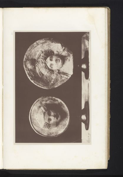 This is Marcel Gustave Laverdet’s photographic depiction of two terracotta objects: a sculpture of Medusa’s head with wings, and a vase bearing her face. Laverdet uses a stark contrast between the objects and a dark backdrop. The eye is immediately drawn to the textured surfaces of the terracotta, emphasized through the play of light and shadow. The composition is vertically oriented, leading the eye from the winged head down to the vase below, creating a visual dialogue between the two representations of Medusa. The rough materiality of the terracotta, captured in the photograph, speaks to the themes of ancient myth. The objects, frozen in Laverdet’s frame, invite reflection on the enduring power and symbolic potency of Medusa.