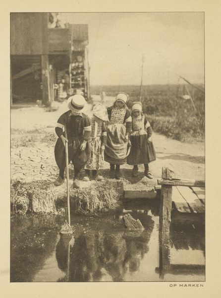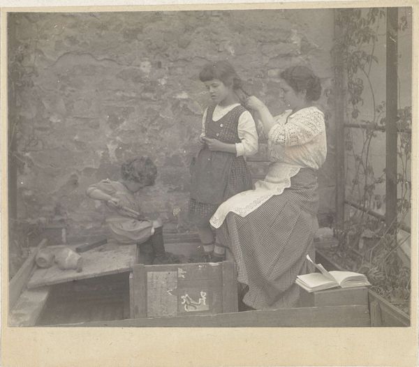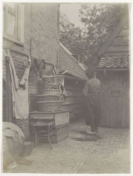 Peter Henry Emerson made this platinum print titled "A Garden End (Suffolk)" using photography, an artistic medium gaining momentum in the late 19th century. The composition is built on a play of light and shadow, with the soft focus lending a dreamlike quality to the scene. Emerson uses tonal range from the dark clothing of the figure on the left, to the bright sky to create depth, leading the eye through the garden space. The figures are placed asymmetrically, drawing attention to the everyday activity of gardening. This quiet domesticity underscores Emerson's broader philosophical project which challenged the artificiality of academic art through naturalistic representation. His approach, rooted in the structural qualities of light and composition, aligns with the era’s discussions about photography's role in reflecting reality. The print invites us to reflect on the evolving notions of art. Rather than presenting a fixed meaning, it engages with the shifting discourses around visual culture.