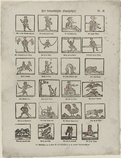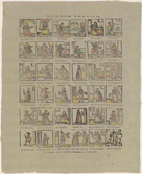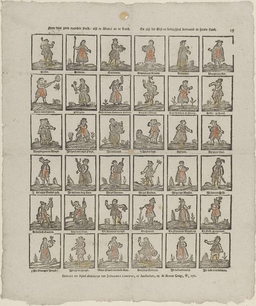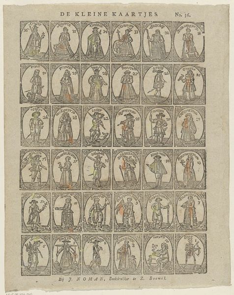 Curator: Well, this is an unusual piece! What do you make of it? Editor: It reminds me of a bizarre deck of cards, or maybe a kind of satirical game. The tiny figures are stiff and formal, but something about their exaggerated postures feels almost… playful, even subversive. Curator: That's astute. What we have here is titled "Floskaartjes" and comes to us from circa 1822-1849. It's a drawing, or more precisely a print made via engraving, created by Jan de Lange II, held in the collection of the Rijksmuseum. Editor: Engravings have such a capacity to carry symbolic meaning and in this one, I see this attempt to capture Dutch society— a royal presence alongside farmers, soldiers, craftsmen... Each little frame appears to capture its own complete symbol. But I have to admit, beyond this very general impression, I am curious, what was this really made for? Curator: Indeed! It would have been printed, most likely as part of a series by J. de Lange’s printing shop. One could see this artwork within a broader cultural phenomenon wherein satirical depictions and visual commentaries of everyday life took root, which coincided with broader social shifts of this period. Consider it as something of a social mirror – exaggerated, yes, but recognizable. Editor: So it’s more social commentary than playing cards? The visual shorthand the artist uses to communicate class and role is fascinating. Is there much established meaning attributed to each of the figures portrayed? Curator: This sort of imagery helped reinforce and negotiate class divisions. These popular prints contributed to creating and disseminating social stereotypes of the era, which often had political undercurrents. In that, their symbolism, their caricature, they spoke volumes beyond their miniature scale. Editor: Yes, I think I am beginning to see how it can almost function as a coded map of the Netherlands in that era. Thank you for shedding more light on what I initially interpreted as an intriguing visual catalogue. Curator: It's a pleasure. A small piece like this opens a surprisingly large window into the society that created it.