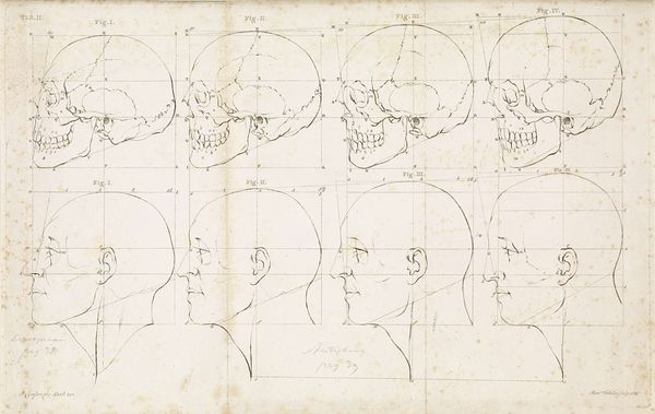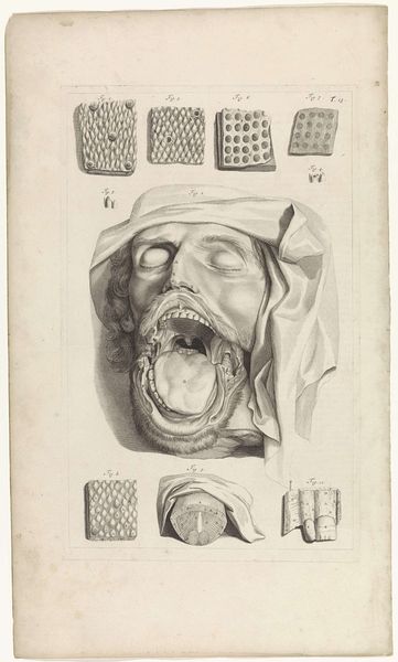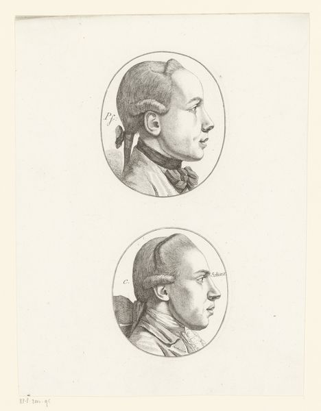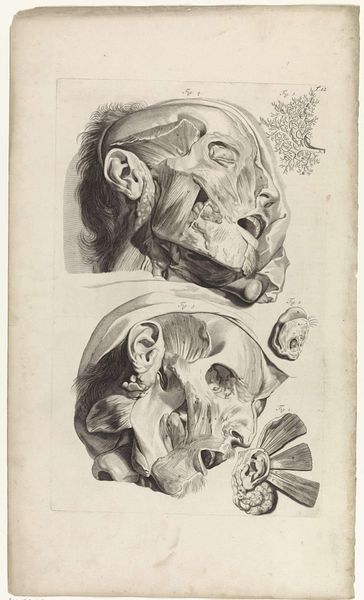 Curator: This etching by Pieter van Gunst, titled "Anatomische studie van het hoofd," dates back to 1685 and can be found here at the Rijksmuseum. Editor: It's stark, isn't it? Stripped bare in a way that feels almost brutally honest, yet softened by the delicacy of the etched lines. There's an arresting stillness. Curator: Absolutely. We see that in the late 17th century there's an increased scientific investigation coupled with, of course, long standing social proscriptions. So to have a print like this available made new forms of knowledge accessible. Think of how this might have circulated among medical students, or perhaps even educated laypeople interested in science! Editor: Yes, exactly! Even the arrangement of the two heads – one showcasing the skull and musculature, the other the brain – strikes me as deliberately symbolic. The unveiling, so to speak, of the self; progressing from exterior facade to interior mechanism. The almost symmetrical rendering of the brain’s two hemispheres gives me a peculiar sensation; suggesting perhaps some balance between the physical and intellectual aspects of man. Curator: That ties in nicely with the academic art context here. The anatomical study held significant importance and, given the nature of its circulation via printmaking, underscores the Enlightenment idea of democratization of knowledge, despite the hierarchies in accessing that information. This democratization inevitably altered medical education but also, how society understood the body. Editor: It's almost an early form of ID photography, an acknowledgement of what it means to *be*. Seeing this depiction of brain separated so starkly within the skull, reminds me also of traditional symbols. We see the broken container that contains hidden meaning that perhaps is only accessible in rare and, quite often, terrifying conditions. The work speaks to an intersection of our quest for knowledge but it has this eerie detachment too. Curator: Agreed. The cool detachment allowed viewers to digest the imagery, fostering critical inquiry while distancing them from some of the gorier aspects. Van Gunst seems quite conscious of making this less sensational and more of a measured intellectual endeavor. It is that duality – science and sensationalism that seems to capture that moment. Editor: Ultimately, for me, the impact remains in its symbolic power: a compelling exploration of mortality, knowledge, and self. Curator: For me, this highlights the intertwined development of visual representation, science, and society in the late 17th century, something not often accessible to museum-goers and audiences beyond, today.
