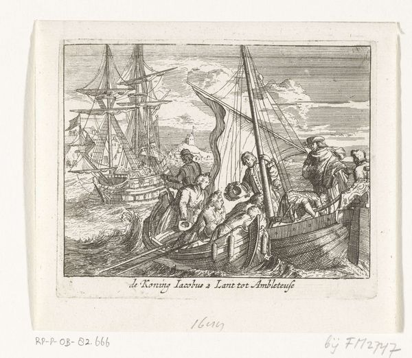 Curator: Oh, isn't this dramatic? This is a print titled "Arion on the Dolphin," dating sometime between 1873 and 1894, by Henri Felix Vion. The scene is a touch chaotic but undeniably romantic. What do you make of it? Editor: My first impression is one of performativity. It’s about being watched. We have Arion in the foreground striking a pose, while a crowd on a boat bears witness. Even the dolphins feel like part of the audience. Curator: Yes! Arion was, after all, a celebrated musician and poet in ancient Greece, whose life took a rather unexpected turn. This print, rendered through the delicate art of engraving, immortalizes the pivotal moment of his rescue. Thrown overboard by pirates, legend has it that dolphins, enchanted by his music, saved him, carrying him safely ashore. It's so fantastically improbable! Editor: Improbable, yet the legend is potent with possibilities. What interests me is not just the moment of salvation, but what precedes it. The story often glosses over the violence that put Arion in the water in the first place. Pirate narratives, both then and now, have always danced around themes of exploitation and the ruthless pursuit of wealth, silencing those, like Arion, whose art challenged power. Curator: That's a keen observation. It does bring an interesting tension to the romantic rescue narrative. This version, bathed in chiaroscuro, feels less celebratory and more like a staged act for the pirates looking on. Even the dolphins, benevolent as they are, seem to be playing their part. Editor: Exactly! And if we are going to view this as a political narrative, the question we should ask ourselves is: who are the real saviors? Are the dolphins merely instruments, or do they symbolize the disruptive potential of the natural world resisting human cruelty? Curator: Hmm, I like that thought, because at the time Vion produced this piece, there was definitely rising political tensions and the working class was increasingly expressing dissatisfaction towards the elite... Perhaps these dolphins serve as avatars of the oppressed. That sounds pretty radical! Editor: Maybe. I mean, who knows what Vion really intended us to feel. Perhaps that tension—between the mythic rescue and the historical backdrop of exploitation and political conflict—is precisely where its enduring power lies. Curator: A poignant tale indeed. I feel like I am seeing it in a new light! Editor: Art history offers a way of hearing those echoes and bringing their critical music into the present.