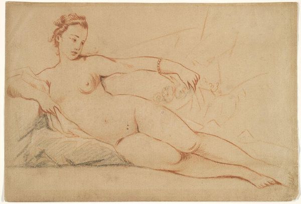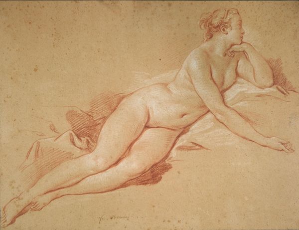 Curator: This is an intriguing drawing, "Venus and Cupid," housed here at the Harvard Art Museums. It's rendered in red chalk and its creator, sadly, is unknown. Editor: The mood is so serene, isn’t it? Venus looks utterly at peace, almost dreaming. And the red chalk gives it such a warm, sensual feel, like a flushed memory. Curator: The anonymity is interesting, isn't it? It asks us to consider the drawing not as a product of individual genius, but as a cultural artifact reflecting broader ideas about beauty and love. The institutional framing of "anonymous" can also erase marginalized voices, though. Editor: I love how Cupid is depicted here – not as the mischievous troublemaker, but almost as a tender caretaker, watching over his mother. The texture is just fantastic; you can almost feel the fabric. Curator: Indeed, while the artist's identity remains a mystery, the drawing itself offers a window into artistic practices and aesthetic values of its time. Perhaps one day, new research will reveal its origins. Editor: It definitely invites you to slow down and savor the simple beauty of form and emotion. A little dose of serenity, unearthed from the archives!