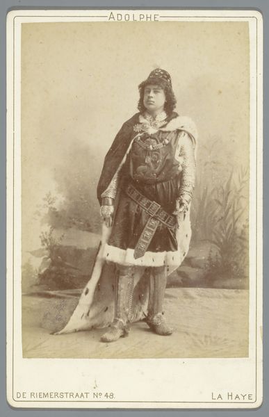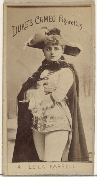 Curator: Here we have a card from the Actresses series (N245) from around 1890, distributed by Kinney Brothers to promote their Sweet Caporal Cigarettes. It features Babette Rodney and, well, it’s a fascinating example of commercial printing and early photographic reproduction. Artist: Fascinating! My first thought is – oh, to be draped like that! So theatrical. The texture and light hint at satin and velvet… and it makes me want to step into that scene, onto that stage. There is a sepia dream quality. Curator: Yes, consider how this image was produced. Think of the processes: photography, then likely some form of photolithography to enable mass production for distribution with cigarette packs. It blurs boundaries—is it art, advertising, a collectible? All of the above? Artist: Absolutely, that interplay! It feels like a captured moment, an actor backstage perhaps, ready to become someone else entirely. It’s romantic! A portal through smoke and mirrors, quite literally tied to… tobacco. Curator: The economics are vital! Cigarette companies employed these cards as a strategy to boost sales. Rodney, though perhaps not a household name today, benefited, gaining exposure through the reach of this very distributed image. Did this lift the cultural status of acting itself, though? Did its means diminish art? Artist: A point well taken. Yet isn't it interesting that these very images—meant to fade as ephemeral marketing—now reside in institutions like the Met? Maybe the commercial root doesn't diminish but rather deepens the conversation—what is “high” or “low” art anyhow. And frankly, I do find the pose and detailing around her shoulders pretty artistic, beyond the simple 'marketing' motive you describe. Curator: Indeed, context shapes value. That this object, originally disposable, now prompts aesthetic reflection tells us volumes about cultural shifts and the changing perceptions of value and ephemerality. Its value is, in fact, completely shifted! Artist: What was intended for fleeting consumption became enduring. And seeing the artistry intertwined with the commercial element actually excites me further. Curator: For me, it really highlights how everyday objects become archives of social history. Each print holds its own stories! Artist: Agreed, stories etched in light and shadow, hinting at forgotten performances and smoky parlors. I find myself eager to research more. Thank you.