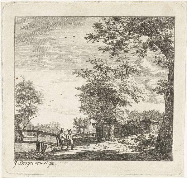 Curator: What a lovely scene! I find it quite charming at first glance. There's a quietude about it that draws you in. Editor: I agree, there's an immediate pastoral sense. The detailed rendering of the foliage and the textures suggest meticulous crafting of this print. We're looking at “Dorpsgezicht”, which translates to "Village Scene", an etching by Johanna de Bruyn made sometime between 1732 and 1782. Curator: Knowing the title, I’m struck by how this artwork reflects eighteenth-century genre paintings where idealized rural life serves as a subtle critique of increasingly urbanized spaces and the class structures reinforced there. De Bruyn presents a vision—perhaps a wistful one—of communal existence outside that paradigm. Editor: Absolutely. Note the dominance of natural elements versus constructed architecture—the tree practically consumes the composition, its branches sprawling above the small dwellings and figures. De Bruyn is highlighting the essential materials—the very substance—of rural existence: earth, wood, water, presented via skilled deployment of the etching process. The line work alone speaks to sustained physical effort, implying that labour yields aesthetic harmony. Curator: Yes, and the figures! Look at the grouping near the center: presumably a father and child walking with burdens on their backs. The scene depicts movement but with such ordinary weight, hinting at labor and social position that can resonate even today as we explore mobility and immigration through modern social justice lenses. What do you see in the textures and patterns employed? Editor: The use of etching allows for a really fine grain in depiction of both foliage and stonework. Observe closely and it's evident de Bruyn varied her pressure to achieve different tonal ranges, resulting in subtle gradations that create both depth and nuance across the work surface. She isn’t merely recording visual details, she is consciously engaging with her material. Curator: It reminds us that art isn't just about aesthetics but is also a process, material and context bound up with history and identity! Editor: Indeed, and thinking about Johanna de Bruyn's decision to focus on common village life tells us a lot about potential buyers, too, and their aesthetic taste and consumer power in the late 1700s. The pastoral print reveals the prevailing relationship to nature as a resource during this period, thus capturing more than a landscape. Curator: It's a beautiful example of how an artwork, seemingly simple, engages in dialogues about societal anxieties, class structures, and longing, making it perpetually relevant. Editor: It encourages contemplation of material and history's presence right before our very eyes.