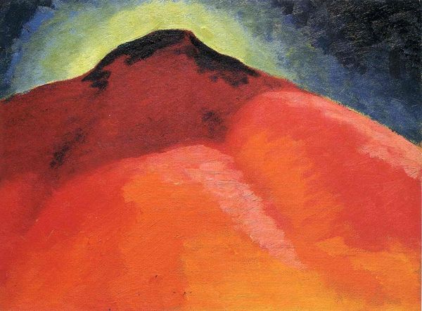 Georgia O'Keeffe painted "Small Purple Hills" with oil on canvas, capturing the essence of the New Mexico landscape. The undulating hills dominate the canvas, rendered in rich, earthy tones that range from deep reds to soft purples, evoking a sense of warmth and tranquility. O'Keeffe masterfully uses color and form to abstract the natural world. Notice how the gentle curves and rounded shapes of the hills create a sense of depth and volume, while the subtle variations in color suggest the play of light and shadow across the landscape. The composition is carefully balanced, with the hills rising towards the center of the canvas, drawing the viewer's eye upward. O'Keeffe's painting explores the intrinsic beauty and power of the natural world, inviting us to contemplate the hidden structures that underlie our perception of reality. The painting encourages us to look beyond the surface and to appreciate the deeper meanings that can be found in the world around us.