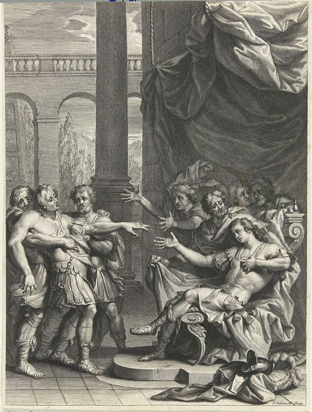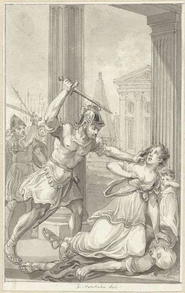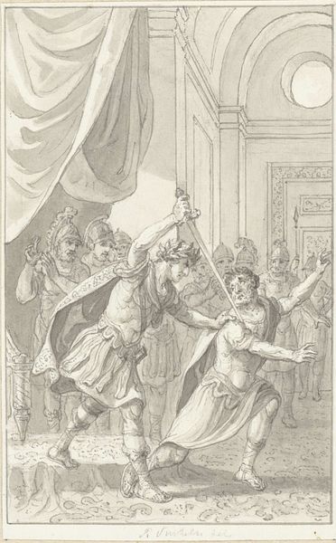 This engraving, made by Reinier Vinkeles, depicts the biblical scene of Adonia’s death. The central focus is the act of violence itself. The raised spear—a symbol of power and authority, but also of potential brutality. Consider how gestures of supplication, like the one made by Adonia as he pleads for his life, echo across time. We see similar gestures in ancient Roman sculptures and Renaissance paintings, each instance carrying the weight of human desperation. It’s a visual language deeply embedded in our cultural memory. The emotional intensity of this scene is palpable. Fear, desperation, and the cold resolve of the executioner are all portrayed through the figures’ postures and expressions. Such displays of raw emotion tap into our primal understanding of life and death, engaging viewers on a subconscious level. The symbolic use of weapons continues to evolve, manifesting in different forms across history. From the swords of antiquity to the firearms of modernity, the tool of violence continues to carry complex emotional and psychological associations.
