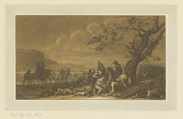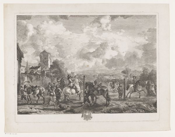 Editor: Here we have Jean Moyreau's etching, "Soldaten en aanvoerders in een legerkamp," created sometime between 1733 and 1762. It's currently held at the Rijksmuseum. It almost feels like a staged photograph from a war movie set... what strikes you when you look at it? Curator: Ah, yes, there's a quiet hum of staged activity to it, isn’t there? It makes me think about the layers of meaning hidden beneath seemingly simple genre scenes. Look at the meticulous detail Moyreau gives to the tree, how its branches reach and twist. It’s almost as if the natural world is a silent witness to this meticulously organized chaos. It seems to ask: where do you look first? Editor: Definitely the tree! It dominates that corner and has great detail. So much is happening around it though – were these kinds of scenes popular? Curator: Immensely! The "legerkamp" or "army camp" scene was practically a genre unto itself. Think of it as a snapshot – though meticulously constructed, of course – of military life. There's this fascinating dance between portraying the reality of conflict and offering a subtly idealized, palatable view for the patrons. You sense the preparation and precision that war entails. And that immaculate, if rather calm, landscape, adds to the somewhat false scene. Editor: It is interesting to think of an etching as a sort of carefully staged 'photo'. I learned how even seemingly straightforward depictions can carry such nuanced meaning. Thanks! Curator: My pleasure! Perhaps art teaches us less about history, and more about how humans have, through history, framed their understanding of the world around them!