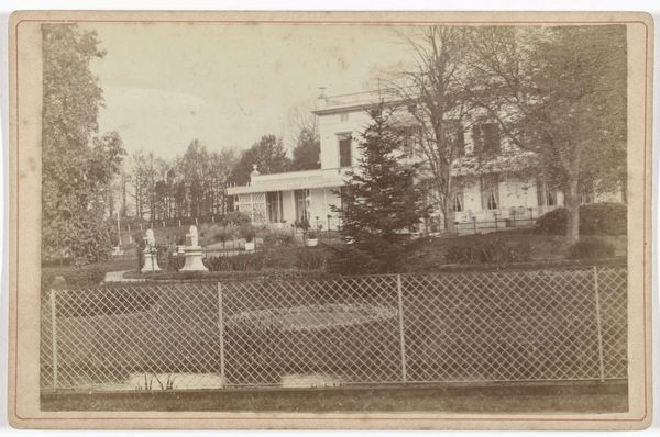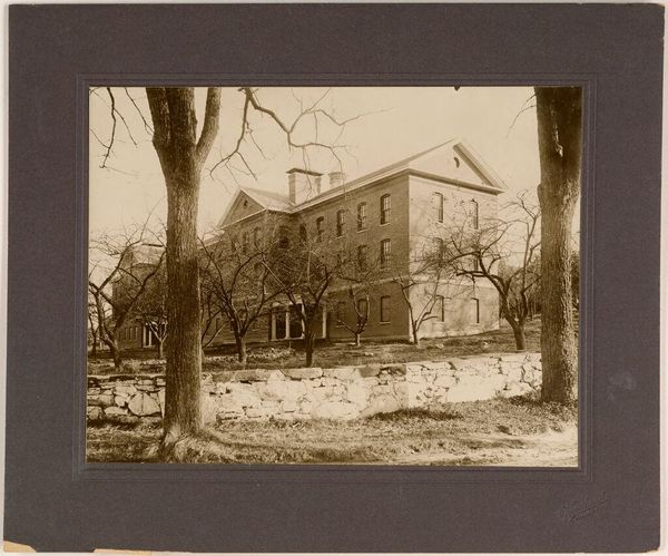 Curator: Woodhead Studio's 1906 photograph, titled "Defectives, Epileptics: United States. Massachusetts. Palmer. State Hospital for Epileptics," presents a stark view of the facility. Editor: My first impression? Bleak. The sepia tones add to that sense of cold institutionalization, despite the leafy trees. Curator: Indeed. The composition directs our gaze from the unkempt foreground up to the rigid, symmetrical architecture of the hospital. Note the imposing scale of the building relative to the landscape. Editor: The trees, though, offer a counterpoint. Their bare branches reach up, a kind of fragile beauty against that stone facade. Perhaps a subtle commentary on the human spirit within? Curator: Perhaps. The photograph, beyond its aesthetic qualities, serves as a historical document, forcing us to confront societal attitudes towards mental health at the time. Editor: It is a potent reminder, isn't it? Art that makes us question and reflect, even when—or perhaps especially when—it's uncomfortable. Curator: Precisely. Woodhead's image invites us to consider both the physical and emotional landscapes of this forgotten history. Editor: And maybe, in doing so, helps us cultivate a bit more empathy in the present.