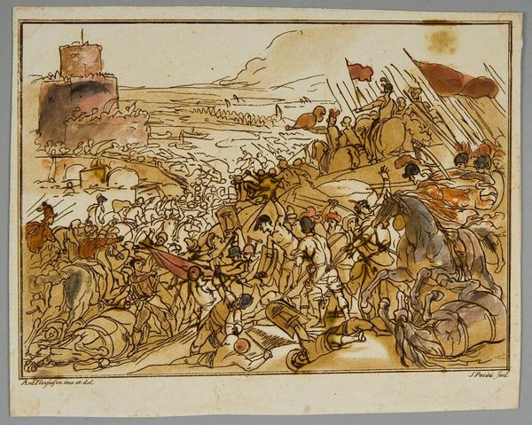 Curator: Santi Pacini, born in 1735, crafted this pen and brown ink wash drawing, "Band of Marauders." The scene depicts a chaotic landscape under siege. Editor: Immediately, I’m struck by the sepia tones—it gives it a vintage, almost dreamlike quality, despite the destruction depicted. Curator: Pacini's work invites us to reflect on the disruption and violence enacted on populations during times of conflict, a theme deeply intertwined with social power dynamics. Editor: The loose, almost frantic lines really amplify that sense of disorder. You can almost feel the energy of the chaos radiating from the page. Curator: Indeed. It's crucial to acknowledge the historical contexts of colonialism and warfare that underpin such representations of violence. Editor: It’s like a fleeting nightmare, isn't it? Something you see and then it's gone, leaving you unsettled. Curator: Considering Pacini’s lifetime, these depictions gain further meaning within the framework of contemporary discussions on historical trauma. Editor: Makes you think about how art can freeze those horrible moments, so we don't forget what humans are capable of, huh? Curator: Precisely. It offers a space for critical reflection on the cyclical nature of violence and power. Editor: Well, it's definitely burned itself into my brain—a reminder to stay alert and compassionate, even when the world feels like it's burning.