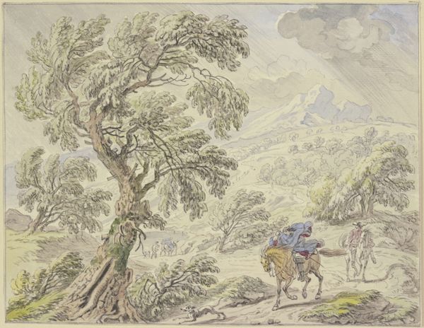 Curator: Here we have Dirk Maas's "Landscape with Thunderstorms," currently held at the Städel Museum. The work employs chalk and pastel, quite effectively. Editor: It’s rather dramatic. The stormy atmosphere immediately creates a sense of unease, an unsettling feeling. There’s almost a premonition of disaster hanging in the air. Curator: Indeed. The dynamism stems from the diagonal arrangement of forms. Note the sharp contrast between the bright, almost violently illuminated sky and the darker foreground. Maas constructs tension through juxtaposed elements, using the trees to frame this spectacle. Editor: The figures seem caught in this tumultuous landscape. There's a hunt underway. The urgency of their escape, almost a flight, mirrors broader societal anxieties. Was this period of intense climate change exploited by the elite for its labor and for land? I can't help but question the implications here. Curator: You raise an interesting point, however the formal execution, especially the detailed rendering of the foliage versus the more gestural depiction of the storm, provides another avenue for appreciation. He masterfully differentiates textures within a limited tonal range, adding layers of visual information that invite close inspection. Editor: Perhaps. But ignoring that many climate-related artworks can show displacement of resources and oppression would be harmful to viewers, I think. How the artist presents those relationships of power, or obscures them, also must influence the artwork, don't you think? This wasn't simply an interesting cloud. Curator: I see the piece foremost as a demonstration of Maas’s sophisticated control over line and form, creating visual harmony between chaos and order. Editor: But order imposed in what circumstances, and at whose expense? Ultimately, what stands out is how this ostensibly romantic depiction of nature reveals complex interplays of humans within historical weather events. It challenges us to think critically about history, agency, and power in this Dutch Golden Age vision of a storm, which is incredibly powerful. Curator: A valid, if very divergent, reading, but I would emphasize the importance of the artist’s sophisticated construction, the artifice itself... the controlled interplay of light and shadow. Editor: Precisely. And within the control lies power, the story…and isn’t it, fundamentally, the story we should always be interrogating?