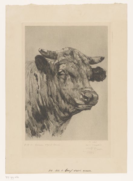 Pieter Bartholomeusz. Barbiers created this lithograph, "Stierenkop", using a technique that democratized image-making. Lithography involves drawing with a greasy crayon on a stone or metal plate, then applying ink that adheres only to the drawn areas. It allowed for relatively quick reproduction, moving away from the laborious, highly skilled work of engraving. The resulting print retains a directness from the artist's hand, akin to drawing. Consider the social context: agriculture was a key aspect of Dutch economy and identity. Depicting a bull's head wasn't just about accurate representation; it spoke to the relationship between humans and animals, and the realities of labor. Think of the work involved in raising livestock, the economic value placed on these animals, and how lithography, as a medium, played its own role in shaping these cultural values by bringing images like this to a wider audience. By focusing on the materials and the processes of making, we can understand how this print reflects the changing social and economic landscape of its time.