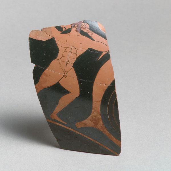 This fragment of a terracotta amphora was crafted by an anonymous artist in ancient Greece, using the distinctive red-figure technique. The imagery presents a male figure adorned with a wreath, standing beside two horses. This scene provides a glimpse into the values of ancient Greek society, where athletic competitions and equestrian skill were highly esteemed, celebrated in both public life and artistic representation. The amphora, as a vessel, suggests contexts of social gatherings, symposia, or even funerary rituals, where depictions of prowess and status served to reinforce social hierarchies. The creation and use of such vessels were deeply intertwined with the economic and social structures of the time. Further research into archaeological records, social histories, and iconographic studies can help us understand better how these artworks functioned within their original cultural context. The meaning of this fragment is contingent on these complex social and institutional settings.