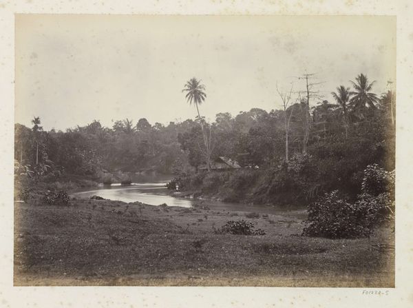 Curator: This photograph, likely taken between 1920 and 1930, is entitled "Strandgezicht met huis en palmbomen in Nederlands-Indië" which translates to "Beach view with house and palm trees in the Dutch East Indies." It’s a gelatin silver print by Klaas (I) Kleiterp. Editor: It evokes such a feeling of isolation, almost melancholy. The monochrome lends it a timeless quality, and the slightly faded tones create a sense of distance. The strong horizontals dominate – the beach, the waterline, and the line of trees beyond, each pulling the eye further away. Curator: Absolutely. The choice of a monochrome medium is very deliberate. Black and white photography removes the distraction of color, forcing the viewer to concentrate on form, texture, and light, elements all skillfully managed by Kleiterp here. Notice how he uses the repetition of palm trees as almost rhythmic marks across the frame. The slight upward diagonals contribute to a sensation of looking deeper into this remote view. Editor: The palm trees have this peculiar symbolic weight, don’t they? Beyond just denoting a tropical place, the slightly leaning silhouettes remind me how often these landscapes appeared in orientalist artwork representing some vision of the "exotic Orient," a construct shaped more by Western desires than grounded reality. Curator: Yes, indeed. Palms have often functioned as a signifier of abundance, of paradise, but within the colonial framework, it speaks to ownership and the gaze of empire. And here, that solitary house almost acts as a witness to a history of Dutch colonialism, silently observing what might lie underneath this postcard vision. It sits between the tropical forest and trimmed ground like the cultural imprint imposed into that landscape. Editor: Despite the somewhat softened tones, I can trace modernism here in how this vista of the distant beach with house is flattened and how geometric it looks like. It brings awareness of how two-dimensional and fabricated it truly is. A powerful subversion, I might add, and done skillfully in gelatin-silver print. Curator: This perspective does trigger those reflexions indeed. So much here is intertwined; paradise is weighted with presence, beauty touched by memory. Editor: This photo leaves us in thought of the artfulness with which historical echoes linger in otherwise straightforward depictions.