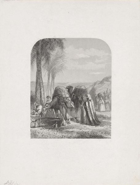 Editor: We're looking at "Two Young Indonesian Women with a Parrot," an engraving by Edouard Taurel, dating from 1841 to 1892. The delicate lines create a sense of serene domesticity. What do you see in the way the composition functions? Curator: Note how Taurel meticulously organizes light and shadow to construct depth within this two-dimensional space. Observe the stark contrast defining the women's figures versus the softer gradations suggesting foliage and distance. Editor: So, the stark contrast defines the figures? Curator: Precisely. This strategic deployment of chiaroscuro elevates the subjects. Note the positioning of the figures in relation to the architectural framework; a compositional strategy guiding our gaze. Is it successful at bringing balance to the art piece? Editor: I think it is! The parrot on the left is balanced by the darker shadows on the right. Does the texture play any sort of role in understanding the space? Curator: Most certainly! Observe how variations in line density fabricate a tactile experience – smooth skin juxtaposed against the rough hewn textures of the hut's structure. Notice how the textures animate and provide information about the cultural context. The convergence of these techniques sculpts the image’s very affect. Editor: I see, the visual textures combined with the balanced contrasts give the piece a serene aesthetic. Curator: An astute observation! Indeed, the masterful modulation of formal elements transforms a simple genre scene into a compelling exercise in visual form. Editor: I see so much more now, thank you.