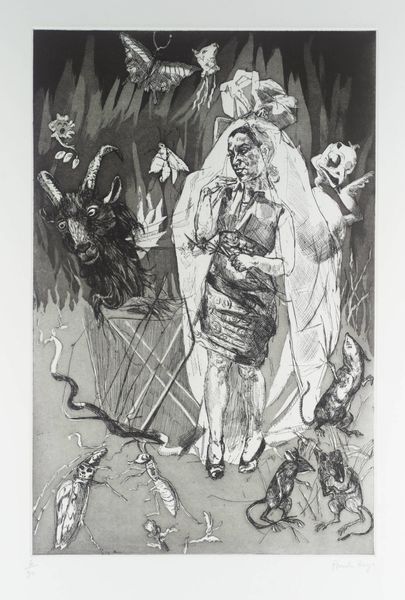 Editor: This drawing, "Topsy" by Sue Coe, depicts what looks like a circus scene. There's an elephant in chains, shadowy figures, and a ballerina near a brightly lit stage. The contrast between light and dark creates such a dramatic and unsettling atmosphere. How do you interpret this work? Curator: The darkness holds echoes, doesn’t it? I see how Coe uses the circus—traditionally a space of entertainment—to stage something much darker. The chains bind not only the elephant, evoking historical subjugation, but also the viewers, linking us to uncomfortable truths. Editor: That's a good point. The elephant does seem to represent something larger than just itself, more like a symbol of exploitation. Curator: Exactly. Coe’s layering of imagery points to deeply ingrained cultural narratives. What do you notice about the ballerina, placed so close to the stage? Editor: She almost looks like she’s outside of the spectacle, or maybe even complicit in it somehow? Is the contrast in the grayscale meant to emphasize her innocence, or a lack thereof? Curator: A crucial question! This could reference the idea of the spectacle masking cruelty, or of performance as a form of control. Do you recognize any cultural references at play here, considering the title, "Topsy?" Editor: I am unfamiliar. Does the artist employ the piece to invoke emotional understanding? Curator: Yes! "Topsy" calls upon the tragic history of a real elephant and connects it to a lineage of abused animals, challenging us to unpack the dark symbology underpinning entertainment. In the piece the symbols have power: both visual and emotional. Editor: It really sheds light on how images carry cultural memory, and how an artist can reveal these narratives. I see things completely differently now, thank you.