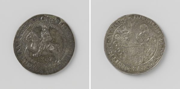 Curator: Well, look at this remarkable artwork. What we have here is a metal relief sculpture from 1522, attributed to Hans Kraft the Elder. The work is entitled "Frederick the Wise, Elector of Saxony". Editor: My first thought? A medieval meme! Seriously, the fellow's intense stare, framed within the coin's circle… It's got that knowing "they don't know" energy, you know? Curator: Indeed! These portrait medallions, so popular during the Northern Renaissance, were powerful propaganda. Note the careful inscription surrounding his profile, proclaiming his titles. It echoes classical coin design, a conscious claim to authority and continuity with the Roman Empire. Editor: So, this wasn't just spare change jangling in his pocket, then? More like a pocket-sized power statement? It's interesting how this rigid profile – a bit severe – hints at a deep interior life, no? Almost stoic. Curator: Absolutely. Observe the reverse side: the cross dividing fields with different inscriptions. Each field features Christian iconography or Latin acronyms, hinting at deeper moral authority. Symbols of governance, religious power, and perhaps a touch of personal piety were all carefully composed. It's as much a statement of his ideals as it is of his office. Editor: Thinking about him, this artifact makes me question our own contemporary portraiture. Now, we can snap a selfie and create hundreds of images, projecting every kind of self that can only be fleeting. Curator: A telling juxtaposition, certainly. A leader's image was very controlled and deliberate during this time. Editor: Knowing the weight and careful design put in such work, this piece provides us with insight into our own selves. Curator: Indeed. By viewing this portrait medallion of Frederick, we encounter the intriguing paradox of enduring image and the fleeting nature of power and persona.