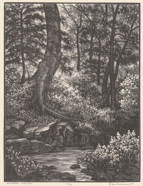 Curator: This print, entitled "Königs Rosen," comes to us from the hand of Wilhelm Heise, who was born in 1892. It evokes a sense of hushed reverence, almost cathedral-like in its verticality. Editor: There's a clear emphasis on the material world. Look at the meticulous detail in the rendering of the plant life—the artist painstakingly reveals texture and form, drawing our attention to the physical substance of these organisms. Curator: It is interesting to see how the botanical study is transformed through printmaking. This was likely made for mass distribution and a growing interest in the natural world. Editor: Exactly, and consider the labor involved in creating such a detailed print. The marks are almost uniform. Curator: The interplay of light and shadow, the stark contrast created through the printing process, lends a dramatic quality to the scene. Editor: Yes, it makes me think about how the materials themselves shape our perception of the natural world. The paper, the ink, and the techniques used all contribute to our understanding of the work. Curator: It has given me a greater appreciation for how societal trends have influenced the art world. Editor: And I see a powerful commentary on our relationship with the environment, reminding us of the importance of preserving the intricate details of our natural world.
