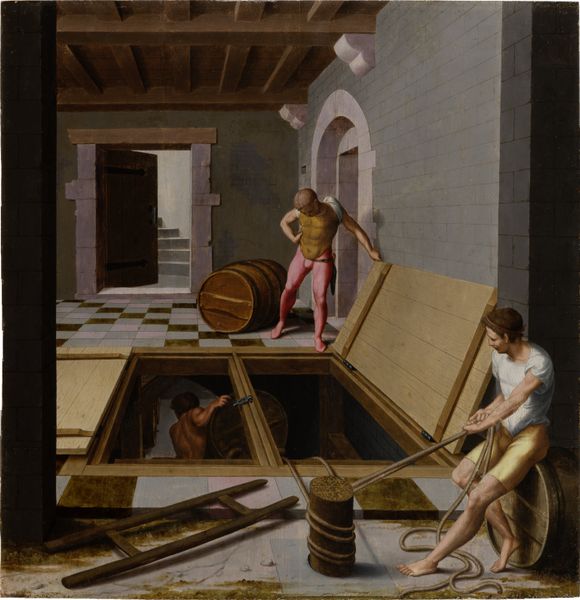 Curator: "The Artist's Studio," dating back to about 1760, by Hubert Robert, now residing here at the Städel Museum. It’s an oil painting capturing…well, an artist's studio. Editor: The immediate impression is the light – it feels hushed and observant, as though the painting itself is breathing. The artist caught at work and frozen within this hushed space feels like time bending around you. Curator: Observe how Robert frames the space using a complex structure of arches and columns, dissecting it. This interplay, along with the light you so keenly noted, creates a structured depth, subtly guiding the viewer's eye. The texture in the architectural elements introduces the charm and history of this interior space. Editor: I get this almost…ghostly, ethereal impression here, like watching the scene of a busy creative space captured with charcoal and fading as you are witnessing it. See that painter in the foreground; that little flash of color and gesture amongst all this age and geometry. I wonder what tale is on his canvas? Curator: Note the sculptural elements interspersed throughout the composition: fragmented torsos, classical busts. Robert strategically deploys these objects, to reflect on artistic lineage, and the construction of meaning through material and form. Editor: So it's less a depiction of reality, and more a meditation on the act of creating? An illusion inside of illusion… It's really making my head spin as the studio becomes some imagined realm of inspiration. Curator: Precisely. Robert is deeply engaged with the dialogue between history and the present, as the structure points to antiquity, juxtaposed to a functioning studio of the present. This creates an interplay of temporality. Editor: What a playful staging of inspiration then. In fact, you find that spark flickering, defying all that rigid architecture. All that remains now for me is imagining the conversations and music and movement happening, while the clock ticks. Curator: A very poetic summation, and indeed captures a core component to how Robert engages in constructing meaning through pictorial composition. Thank you. Editor: Likewise. I feel I've watched this space exist for much longer with your help.