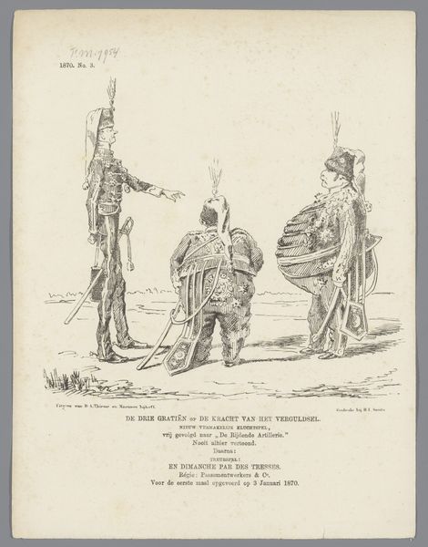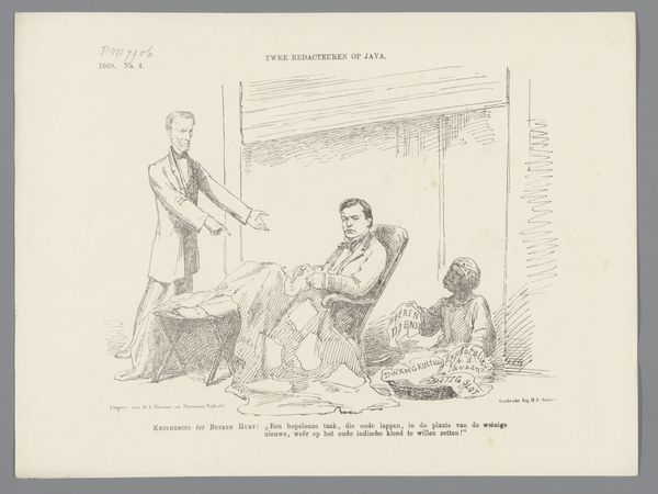 Editor: So, this is "Spotprent met minister Van Bosse, 1868" made by Johan Michaël Schmidt Crans around 1867. It’s a drawing and lithograph, possibly an etching and pen. It’s a caricature, but there’s also a sense of it being a genre painting. I’m really intrigued by the stark contrast and how it feels quite critical. What stands out to you when you look at this piece? Curator: Ah, yes! A delightfully pointed piece of political commentary. I see a country squeezed—*Holland op zijn smalst*, as the title proclaims. Look at the minister perched on that overflowing treasure chest – a picture of discomfort amid supposed wealth! Do you see how the figures around him are almost digging Holland's grave with railway subsidies, and his total refusal? A scathing assessment of shortsighted politics! Doesn't it strike you as darkly humorous, almost theatrical? Editor: Absolutely! It's like a stage play with very blunt symbolism. But the visual style also gives it a sense of historical context – it feels like peeking into a specific moment. Is that accurate? Curator: Perfectly! Caricatures like these served as newspapers, predating photographic immediacy, seizing moments, crystallizing anxieties with savage wit. The stiff figures, the meticulously etched details – it’s all part of crafting a digestible, often outrageous, truth for public consumption. Notice the figures with a modern top hat juxtaposed against that background suggesting progress. Is progress possible with such figures blocking the view? Editor: That really shines a light on the work, considering this historical and societal context. It gives me a deeper appreciation for not just the image but the context too. Thank you! Curator: The pleasure is all mine. It always feels a little richer once the past starts speaking, don't you think?