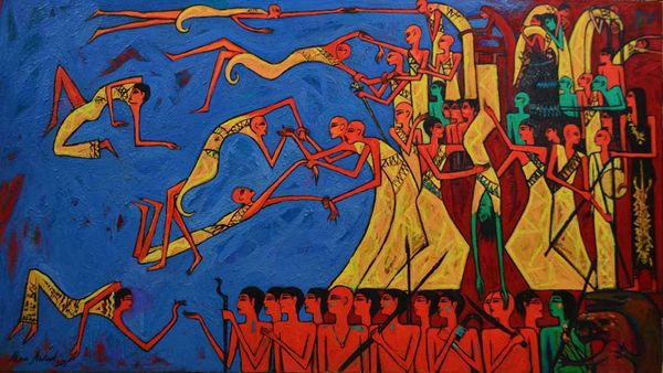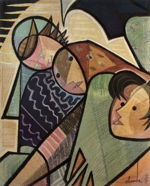 Editor: Here we have Yu Youhan's "Mao in New York," painted in 1995 using acrylics. It’s a pretty arresting image: Mao Zedong looming next to the Statue of Liberty. How do you interpret this juxtaposition? Curator: The power of the piece lies in its iconic clash. The pairing immediately provokes questions about cultural values, revolution, and what 'liberty' means in different contexts. Editor: I hadn't thought of that. Curator: Consider the symbols themselves. Mao, a figure synonymous with communist China, placed beside the Statue of Liberty, representing American ideals of freedom and democracy. What is the artist implying through their encounter? Is it commentary, critique, or perhaps something more nuanced? Look closely at the patterns. How do those choices affect your understanding of the subjects? Editor: Well, the clouds behind Mao feel traditionally Chinese. It makes the image more layered. It feels less like a direct, simple statement. More of a question about values across time and space. Curator: Precisely. And the flattening of the figures into almost graphic forms points towards Pop Art influences, distancing us emotionally while also amplifying the visual impact. Consider, what does it mean to represent revolutionary figures through the lens of pop culture? Editor: It's like taking these heavy historical figures and putting them into the modern world. Thanks, seeing those connections is a real shift. I really appreciate it. Curator: Art, at its best, holds up a mirror. This piece reflects shifting cultural landscapes, making us question our own perceptions and preconceptions. It has been insightful to discuss it with you.