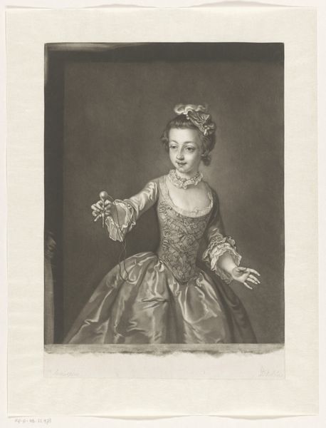 Curator: Oh, I find this print utterly enchanting. There's such a dreamlike quality about it. Editor: Indeed. Here we have "Portret van de dochter van Thomas Hudson," a print created sometime between 1735 and 1756 by John (II) Faber. It's an engraving rendered in that elaborate Rococo style. What strikes me immediately is how the engraver utilizes this medium to emulate the sheen of satin and create a play of light and shadow to render volume to this aristocratic woman. Curator: The satin almost spills off the canvas, doesn't it? It makes you want to reach out and touch it, and I am captivated by the quiet bond she seems to have with her little dog friend. Editor: Semiotically, the image offers an intriguing discourse. The young woman, poised next to what seems to be an urn adorned with classical figures, stands as a marker of idealized beauty and aristocratic refinement. The dog—presumably a loyal companion—anchors the composition and perhaps introduces an element of domesticity into this idealized portrayal. Curator: Right? She seems almost too good to be true, yet the presence of her puppy at the skirt of her dress gives the feeling she isn’t stuck up. Editor: The composition further contributes to its Rococo nature: note the ornamental details, soft pastels... Curator: Or, well, their tonal equivalents. I wonder, was it meant as a sort of coy tribute to Hudson by Faber? It feels, I don’t know… celebratory. It has the energy of a birthday card. Editor: The question remains: What nuances in expression and posture reveal societal attitudes toward beauty, gender, and class during this era? Curator: I will leave that for the theorists to uncover! I am much too busy picturing Miss Hudson stepping out of the engraving into a moonlit garden to enjoy it. Editor: The print indeed remains an enchanting artifact and testament to the aesthetic sensibilities and technical skills characteristic of the era.