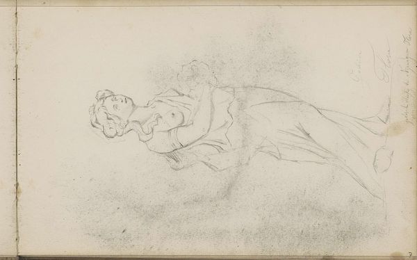 Curator: This delicate sketch is titled "The Artist’s Son, Henry, Asleep" by James Ward. It looks like it might be watercolour and pencil on paper. What are your first thoughts? Editor: It feels very intimate, doesn't it? Almost voyeuristic, but in a tender way. The vulnerability of childhood captured with such soft lines... it's dreamlike. Curator: Ward was deeply invested in the social dynamics of family life, as many artists of his period were. Notice the type of paper he used; what appears to be toned rag paper was gaining traction because of its price point, and became a signifier of its user's socioeconomic background and tastes. These became signifiers and symbols beyond art making and informed everyday material culture. Editor: I love that you see the societal story etched right into the fibers of the paper. For me, it's also about the simplicity. Just a few strokes, really, to convey such a peaceful scene. I find it incredibly effective how he's used these pale washes for shadow and light; almost like he's painting with absence. Curator: Right, there is economy here, both materially and stylistically. The labor involved seems efficient, minimal—part of a larger pattern where the production and consumption of these images reflects shifts in the art market. Editor: Maybe. Or perhaps a parent just quickly capturing a fleeting moment of love. You see a marketplace, I see tenderness, pure and simple. Isn't that okay? That both interpretations are valid, that something can be so interwoven? Curator: It is not only okay; that dynamic interplay is vital for a full understanding of art's function. Editor: I’ll hold onto that image of Henry sleeping, cradled in his own little world. Thanks for enriching that with some insights into materials and making. Curator: Likewise, your intuitive response reminds us to always bring a personal lens to the sociohistorical landscape.