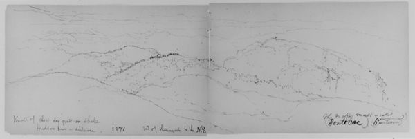 Curator: This is Daniel Huntington's "Gate of the Highlands, Cornwall, 1871," a pen-and-ink sketch originating from a sketchbook. It's currently held at the Metropolitan Museum of Art. Editor: My immediate impression is one of restraint. The composition, split across the sketchbook's center, has a hushed, almost reverent quality. The delicacy of the pen work and minimal shading add to that. Curator: Huntington, primarily a portrait painter, traveled extensively. This sketch offers a glimpse into the Romantic era's fascination with landscape, particularly how rugged environments became associated with national identity. The highlands were often portrayed as the soul of a nation, places of historical and cultural significance. Editor: The repeated jagged lines establish the peaks of those far-off mountainous ridges; they almost reverberate across the horizon. Do you get a sense of the sublime there, Curator? The scale is vast, yet it’s confined within this small frame. Curator: The sketch may explore the visual rhetoric of "picturesque" landscapes, popularized through guidebooks and tourism. These were constructed, consumable images aimed to capture a certain type of beauty and authenticity for an increasingly mobile middle class. I see Huntington grappling with those themes. Editor: True, it flirts with the picturesque. The tonal variation achieves a depth, but I sense more of an engagement with the sheer physical essence of this region. Notice the artist’s delicate articulation of each individual undulation in those slopes. Curator: This was part of a larger sketchbook and wasn't intended for public consumption, as opposed to the finished and exhibited canvases, the elite patrons and cultural institutions influenced which scenes were viewed as significant and worthy of artistic attention. Editor: Right, perhaps a private, almost academic examination. Regardless, Huntington’s work captures the highlands’ stark character in its purest form. The simplicity is powerful; an uncluttered vision of Cornwall's landscape. Curator: Indeed, a private vision, revealing a complex interplay between place, identity, and artistic intention within its unadorned lines. Editor: Precisely, a very simple expression, but that evokes a certain timeless, quiet grandeur of the Highlands.