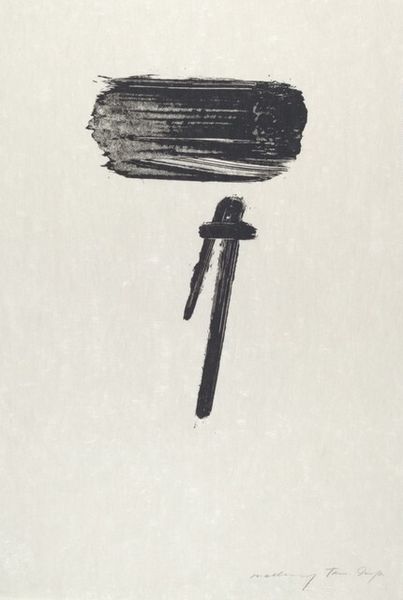 Curator: Well, hello! We're standing before Dirck Nab's linocut print from 2005, entitled "Twee spijkers"—that's "Two Nails" in English. Editor: Two nails...stark. Really raw feeling, isn’t it? The crude, almost violent, carving… and it's so minimal. Just those shapes on the page. Bleak, but also somehow powerful. Curator: Powerful is a great word for it. Linocut is inherently graphic, a bold medium—the areas you carve away stay white, so it’s about reduction, choosing what *not* to show. Think about that symbolically. What are we leaving behind when we hammer something into place? What is concealed or destroyed? Editor: Exactly! Nails have such loaded symbolism, don't they? Crucifixion imagery is the obvious first thought, sacrifice, suffering…but then, also construction, building, holding things together. Are we looking at the instruments of destruction or creation? Nab sets up such a duality. Curator: Nab plays on that tension beautifully, and this isn't a photorealistic rendering. These nails are abstracted, monumental, almost totemic. The larger nail especially feels imposing, maybe a phallic symbol too. It brings an almost brutal masculinity into the composition. Editor: And that smaller one, so lonely next to it... is it a child? Or maybe the aftermath – the legacy of the big nail's actions. What's fascinating, though, is that by stripping the image down to almost nothing, it amplifies those subconscious associations. He’s really digging into the cultural memory. Curator: It’s interesting you call it "digging". This is printmaking, remember? Nab has physically dug these images *out* of the linoleum. To unearth those meanings, and present them to us like some unearthed artifact. Editor: You're right, the process really feeds into the meaning. And the monochromatic palette further emphasizes the bare bones essence. Curator: I think the real punch comes from this almost child-like rendering paired with these quite weighty associations. I suppose that push-pull between formal simplicity and evocative meaning makes this image stick. Editor: Indeed, those nails, even reduced like this, they still hammer home some fairly complicated points! Thanks for nailing it, Dirck!