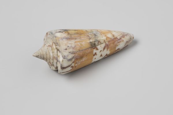 This is a Conus marmoreus shell from the wreck of the Dutch East India ship Witte Leeuw. The shell presents a captivating display of natural geometry and texture. Its conical form, spiraling gently from base to tip, is covered in an intricate pattern of tessellated shapes, each a pale ivory outlined by delicate brown. The shell's surface is weathered and worn, telling a story of submersion and the passage of time. The arrangement of these shapes creates a visual rhythm, a play between figure and ground, that invites close inspection. This pattern is not merely decorative; it's intrinsic to the shell's structure, reflecting its growth and adaptation. Viewed through a structuralist lens, the shell is a sign, a natural artifact imbued with layers of meaning. It symbolizes trade, exploration, and the complex relationship between humans and the natural world. The shell destabilizes notions of perfection, revealing beauty in decay. Its structure reminds us that form and function are inextricably linked, each influencing the other in a continuous cycle of creation and transformation.