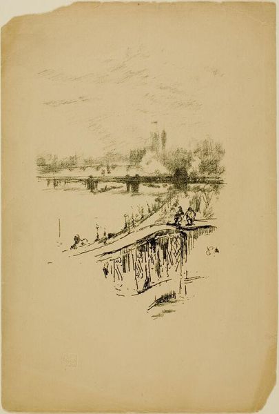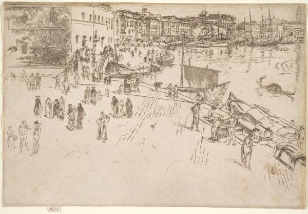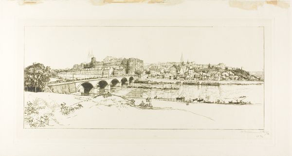 Curator: Joseph Pennell's 1883 etching, "The Arno at Pisa," presents a familiar Italian cityscape. It's rendered on paper, focusing on the flow of the river and the architecture lining its banks. Editor: Immediately, I’m struck by the melancholic air of the piece. The tones are muted, almost sepia-like, creating a sense of faded memory, like a half-remembered dream of Italy. Curator: As an etching, the piece necessitated careful preparation of a metal plate, layering acid-resistant ground, drawing into it, then submersion in acid. The result is that line work, achieved through the careful application of acid-resistant materials to delineate forms. The act of repeatedly exposing the metal to acid etches the design, creating areas that hold ink to yield an impression on paper. Consider the labour behind each mark. Editor: And what marks they are! The dominant imagery is the river itself. Rivers have, across millennia, signified the passage of time, transition, the boundary between worlds, but also offer connections in space between disparate places. See how Pennell uses the reflective surface to almost mirror the architectural history embedded on the riverbanks. It pulls history into the present moment. Curator: I see how the artist prioritizes a sense of place, but I wonder if you agree the technical craft itself is so fascinating here? Notice the variation in line weight – how intentional the artist had to be when applying his line into the ground on the copperplate. Each stroke captures not just visual information, but the deliberate hand of the printmaker at work. The level of precision speaks volumes to Pennell’s commitment to his chosen medium. Editor: Indeed, it's not just about depicting Pisa; it is about using the cityscape to evoke a deeper, more personal understanding of our relationship to places imbued with memory and historical significance. Look how the figure strolling the Arno is so solitary and lost in their thoughts – like we also may be. Curator: It's intriguing to consider how Pennell's detailed etching contributes to our experience of this iconic location through labor, method and skill. Thank you for emphasizing the imagery, offering a much deeper and thoughtful layer than initially struck my eye. Editor: And thank you for guiding me into a deeper exploration into what goes into making such lasting and powerful images that continue to speak across time.