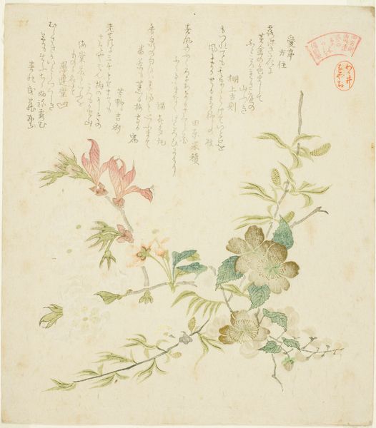 Editor: So, this is "(Plum Branch)" by Kubo Shunman, made in 1816. It’s a woodblock print with watercolor and ink, currently residing at the Minneapolis Institute of Art. I’m struck by how delicate it is, the colors are so muted, almost like a memory. What can you tell me about its place in art history? Curator: It's interesting you call it a memory. This piece comes from the Ukiyo-e tradition, a very specific printmaking movement popular during the Edo period in Japan. Ukiyo-e, translating to "pictures of the floating world," was deeply tied to the rising merchant class and their pursuit of pleasure and beauty. Editor: "Pictures of the Floating World"—so, was this type of art considered… lowbrow at the time? Curator: Initially, yes. Traditional art forms were very closely linked to the aristocracy and the Buddhist clergy. But woodblock prints democratized art making it accessible to a wider audience, including the emerging merchant class. This piece featuring plum blossoms connects to existing artistic traditions, yet its very existence as a readily reproduced print challenges the exclusivity that was normally part of the cultural world at the time. How might its ready accessibility have shifted power dynamics and art's role? Editor: I see, making beauty accessible disrupted social norms! The mass appeal challenged what "high art" was. The plum branch—is that symbolism significant within this cultural and political landscape? Curator: Absolutely. The plum blossom is a potent symbol in East Asian art, representing resilience, renewal, and the arrival of spring even amidst the harshness of winter. Here, what does the choice to portray this already deeply symbolic image in the context of a readily available woodblock print potentially communicate? Editor: It reinforces the idea of accessible beauty, resilience not just for the elite but for everyone. It kind of flattens the hierarchy of symbolism. Curator: Exactly. Seeing how art interacts with social structures adds layers to its appreciation, doesn’t it? Editor: It definitely does. I will not see such botanical prints in the same way.