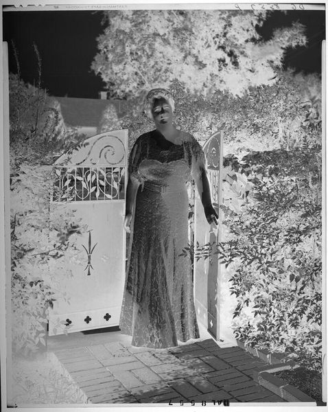 This photographic negative by Robert Burian captures a woman in a long dress, and is suggestive of a moment frozen in time. The photograph's material presence—the grain and contrast characteristic of film—creates a sense of intimacy and immediacy. Looking closely, you can see the texture of her dress, perhaps suggesting the skilled labor of a seamstress or tailor. Even in negative, the garment's form and embellishments are visible, raising questions about its design and the social context in which it was worn. Consider also the other material elements: the painted floral decoration behind her, the crocheted chair cover, and the architectural features of the home. All of these things speak to the material culture of a particular time and place, giving us insight into the lives and values of the people who inhabited it. Ultimately, appreciating photographs like this one involves looking beyond the image itself, and recognizing the social and material forces that shaped its creation and its ongoing resonance.