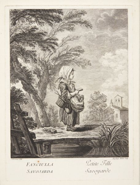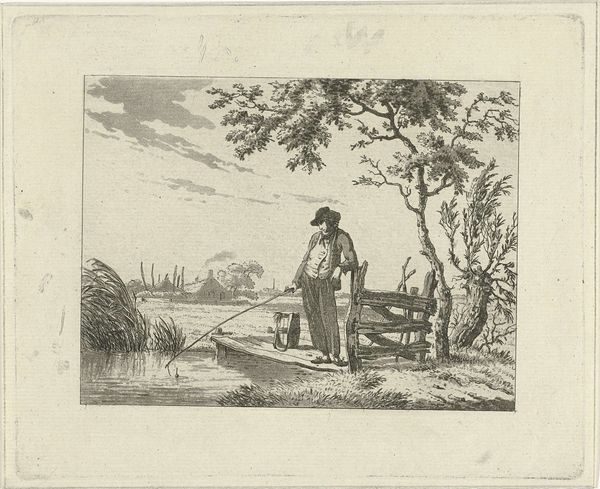 Curator: Here we have "Man Weeping by a Grave," an engraving from between 1751 and 1816, attributed to Reinier Vinkeles, residing here at the Rijksmuseum. It is such an impactful, moving figuration. Editor: It strikes me as melancholy. A very eighteenth-century sort of grief, perhaps. Look at the figure draped against that grand tomb – the lines are so delicate. What kind of paper and inks do you imagine Vinkeles would have worked with for this print? Curator: Likely, given the era and intended market, a relatively standardized paper stock. But, when contextualized, it also reveals societal expectations surrounding death and mourning, particularly for men of this period. Their grief was performative; the grand landscape echoes Romantic notions of man against nature in expressions of heightened emotion. How might Vinkeles' portrayal reflect, or perhaps even subtly critique, such societal pressures? Editor: That's interesting, framing it as performative. From my point of view, thinking about his material choices brings something more visceral. It's the *process* of engraving, carving away at metal, line by line to arrive at such a delicate result - labor. How do materials amplify the emotional quality? I see his fine lines suggesting weakness or vulnerability which challenges norms of Baroque and Classicist composure. Curator: Exactly. This brings a nuance into focus, as Vinkeles could well be leveraging artistic language from these artistic movements to subvert notions of masculine identity within those conventions, layering social expectation atop. We shouldn't overlook the figure on horseback in the background either: a world continuing in its stead. It further contextualizes this image of one grieving man's isolated experience relative to the vast material existence all around him. Editor: Right. The material tells the tale. Considering labor adds another stratum for meaning and interpretation, and lets me read past the art-historical constraints and consider the work from a different frame. Thanks to a fresh look at the medium itself, I'm leaving here thinking less about a generic melancholic figure and instead thinking much more specifically about someone burdened by complex personal and social factors. Curator: Agreed. It's that interplay between art history, the broader social framework and intersectional theory that shapes the most enlightening discourse.
