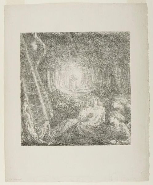 Curator: I find myself immediately drawn into the deep chiaroscuro of this lithograph. There's a dreamlike, almost nightmarish quality. Editor: Let's delve into this enigmatic work by Odilon Redon, created in 1888, titled "...d'abord une flaque d'eau", which translates to "...first a puddle of water." It resides here at the Minneapolis Institute of Art. Curator: Water. Interesting. Though it feels more subterranean, primordial to me. See those figures emerging from the shadows? Their upward gazes—they're not seeking the sun. It feels almost like a collective trauma being unearthed. Editor: Redon's symbolic style is definitely at play. The downward angle, the murky light, the sense of figures suspended—water holds profound symbolic weight. Puddles are liminal spaces, mirroring and distorting reality, representing both reflection and the unconscious. Curator: Absolutely. And look at how Redon manipulates light. It's almost weaponized, cutting through the darkness to expose vulnerability. This speaks to broader discourses of the late 19th century: anxieties around industrialization, shifting social norms. Are these figures complicit, victimized, or rising up? The ambiguity itself is the statement. Editor: Considering Redon's context in France at that time, this work acts like a cultural memory. This was a period preoccupied with spiritualism and the unseen, with Symbolists looking for meaning beyond realism, and here the symbol of rising from the depths can speak about evolution and adaptation to an ever changing world. Curator: Precisely. A puddle seems like a minor thing but we can explore how he manages to portray collective cultural upheaval with subtle symbolic violence that lingers even now. Editor: Indeed. It leaves me contemplating the power of single symbols within complex societal struggles and transitions.