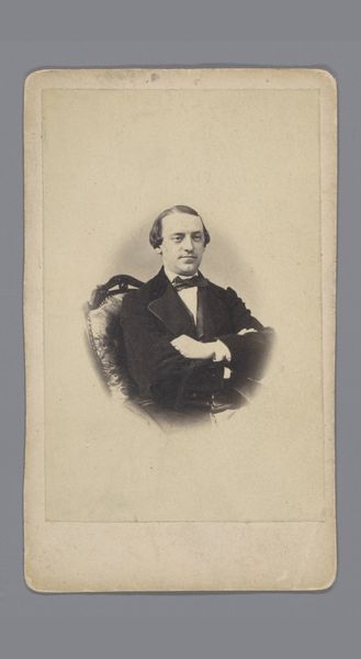Editor: Here we have a gelatin silver print, "Portret van J. Messchert van Vollenhoven," likely from the early 1880s, attributed to Wegner & Mottu. It’s currently at the Rijksmuseum. I find the somber mood striking, almost severe. What stands out to you about the composition and technique? Curator: Observe the careful modulation of light. The gradations of tone from the brighter facial highlights to the subdued backdrop articulate a deliberate formal structure. Note also the subject's hand, precisely placed; this creates a strong diagonal vector leading to the face, and thus a visual hierarchy. Editor: So the composition is designed to guide the eye? Curator: Precisely. The subtle blurring around the edges is also significant. Does this blur flatten the overall image? Consider how the sharp detail of his face competes with this background technique. What are your impressions of the sitter’s clothing, his medals? Editor: It is hard to say, although there are certainly things in this photograph I initially didn’t observe! I hadn’t noticed the subtle blurring until you mentioned it. Thanks for your thoughts on it! Curator: Consider then how the materiality of the print, the gelatin silver itself, affects our perception. It creates a certain level of visual depth through tonal variance, doesn't it? A fascinating play of surface and depth. Editor: Absolutely. This was so informative, thank you.