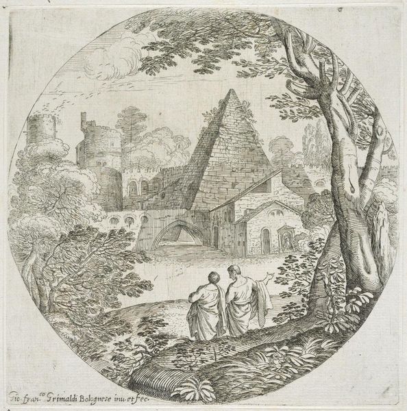 Editor: This is Giovanni Francesco Grimaldi's "Two Horsemen on the Road to a Castle," and it looks like an etching. It’s wonderfully detailed, yet feels so dreamlike. What do you make of the circular composition? Curator: The circle frames a journey, doesn’t it? It’s like looking through a spyglass into a world that's both real and imagined. The riders seem to be heading toward something grand, but the path is winding. I see a quiet moment, a pause before the next adventure. What do you think awaits them? Editor: Maybe a feast, or maybe just a good night's sleep after a long ride! Thanks, that helps me appreciate the composition more. Curator: My pleasure. Sometimes, art is about those quiet moments of anticipation.