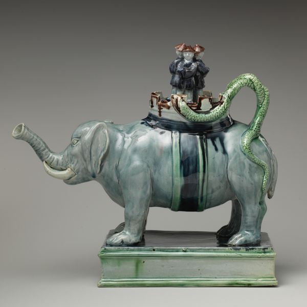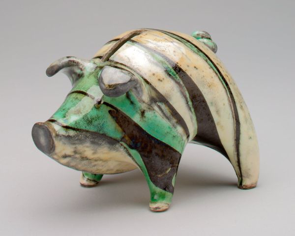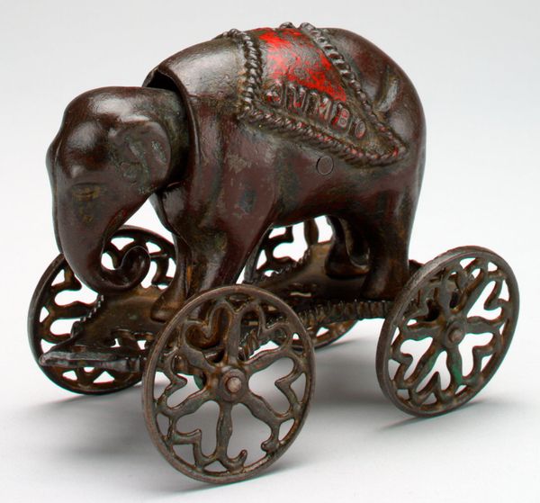 Curator: This cast metal piece, dating from around 1900, is known as the "-Oriental- still bank." Its anonymous maker fashioned it as both a decorative object and a functional item, intended to hold coins. Editor: It's deceptively charming at first glance, but there's an undeniable tension there. The weathered metal and simplified forms have an almost haunting quality, a stark contrast to what I assume was supposed to be playful. Curator: The iconography here is fascinating. The camel, of course, has long symbolized the "Orient" in Western eyes, embodying notions of trade, exoticism, and even subservience. Here it appears with a calf—an additional layer of gentle domestication and also alludes to ideas about wealth, as they were essential in the trading culture and wealth. Editor: That so-called "Orient" being entirely imagined, of course. That period's fascination became a form of cultural appropriation and outright domination. It is important to remember these banks weren't about cross-cultural exchange; they were a means of accumulating wealth, fueled, often, by the very exploitation of the regions the camel evokes. Curator: Yes, and this representation of exotic lands as something to be possessed – miniaturized, secured within one's home – reveals much about the Western mindset. I am reminded of decorative styles where everything Oriental has a kind of luxurious allure but also carries ideas about power imbalances. The camel being placed on a rocking platform emphasizes its commodified form of decoration to serve the home. Editor: Absolutely. It’s hard to divorce its decorative-art appeal from its troubling context. That term "Oriental" plastered on the rocker— it’s a label imposed from the outside, flattening complex realities into a single, marketable brand that is only good for decorating houses, completely dismissing their origins. I would analyze this using postcolonial approaches of inquiry to fully grasp the historic and societal perspectives of appropriation during the early twentieth century. Curator: The patina, worn away from use, whispers about the countless coins that passed through this object—each one reinforcing those established power structures and ideas. The damage to the metal, the visible signs of time and the aesthetic qualities of aging. Editor: Looking at it now, I have such a mixture of sadness, rage and disillusionment, really, with how the "allure" or the attraction can mask deeper, more unsettling dynamics of social history and global capitalism. I find myself searching for a way to return dignity and truthfulness to cultural artistic expression in this "post" era.