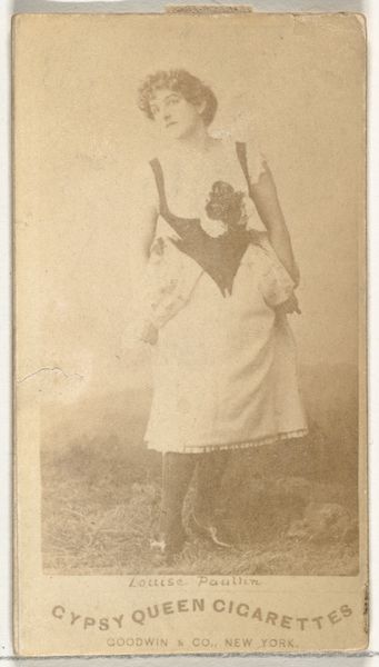 This small card from the Actresses series, promoting Sweet Caporal Cigarettes, presents Jessie Merrilles in a full-length sepia photograph. The composition is dominated by her figure, posed in a theatrical stance with what appears to be a rifle. The limited tonal range focuses our attention on the shapes and forms within the image. The wide brim of Merrilles’ hat creates a strong horizontal line across the upper part of the photograph, balanced by the diagonal of the rifle. Her dress, a mass of diffused light, contrasts with the darker jacket, drawing the eye through the image. The materiality of the card itself, with its slight discoloration and textured surface, adds another layer of meaning. Cards like these functioned within a complex semiotic system. They were not simply advertisements but also collectible objects, their value lying in their ability to signify status, taste, and cultural knowledge. The formal qualities of the image work in tandem with these cultural codes. The actress’s pose and attire signify both femininity and a certain level of performative power. Note that the sepia tone lends the image a nostalgic quality, suggesting that the value of art and beauty is something that lasts.